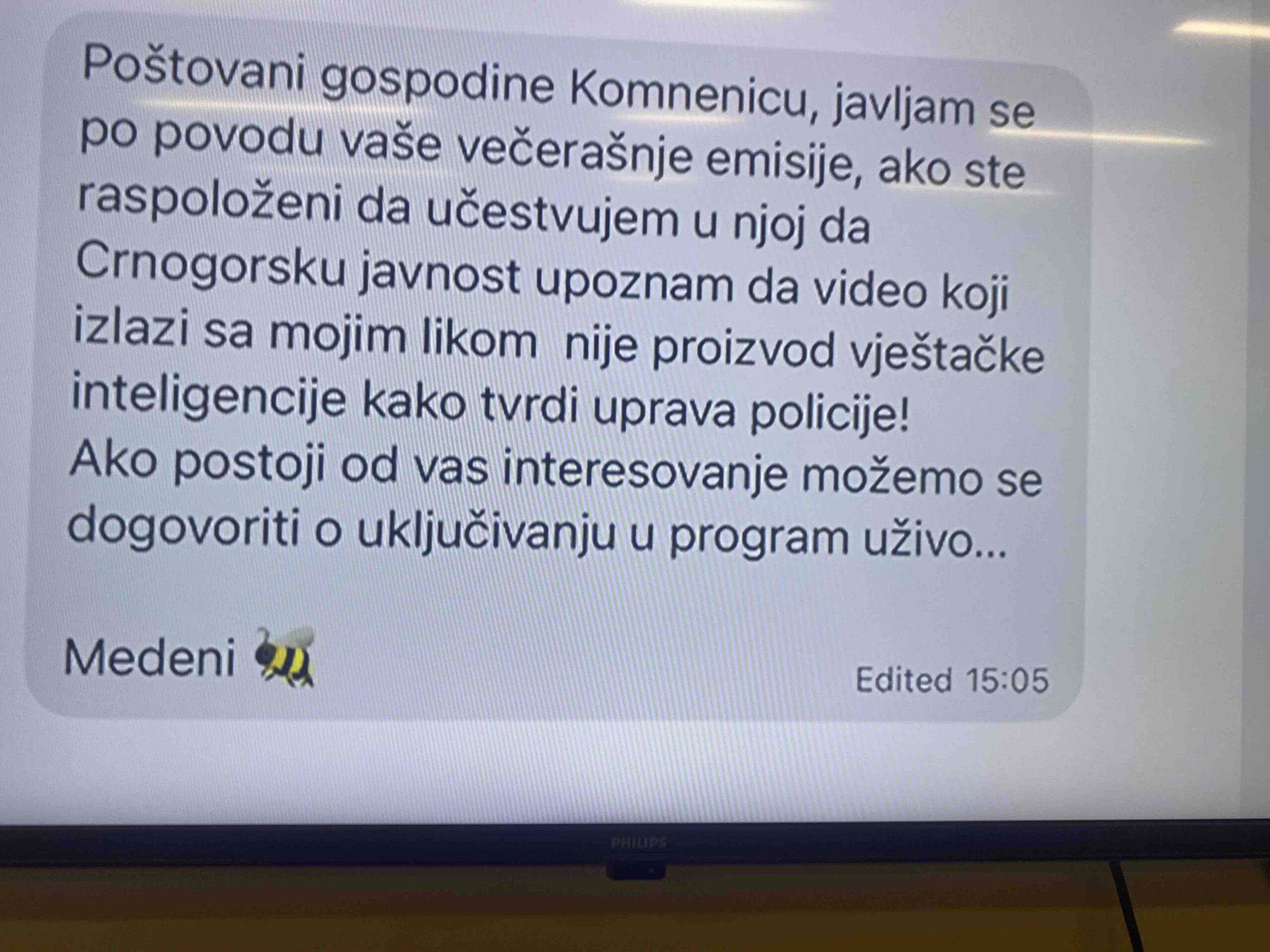 Komnenić je u emisiji „Načisto”objavio sadržaj poruke.„Poštovani gospodine Komneniću, javljam se po povodu vaše večernje emisije, ako ste raspoloženi da učestvujem u njoj da Crnogorsku javnost upoznam da video koji izlazi sa mojim likom nije proizvod vještačke inteligencije kako tvrdi uprava policije! Ako postoji od vas interesovanje možemo se dogovoriti o uključivanju u program uživo… Medeni”, stoji u poruci.