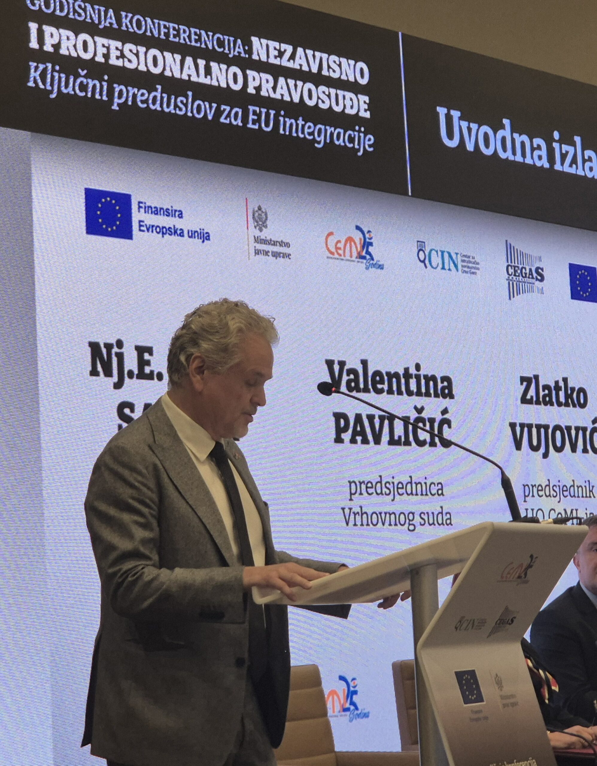 On je pozvao sve ključne donosioce odluka da do kraja 2026. godine sprovedu sve aktivnosti predviđene Strategijom reforme pravosuđa i ispune završna mjerila za članstvo Crne Gore u Evropskoj uniji u poglavljima 23 i 24.