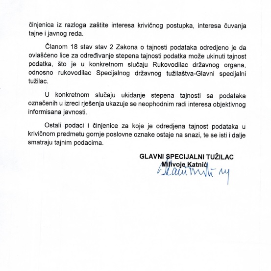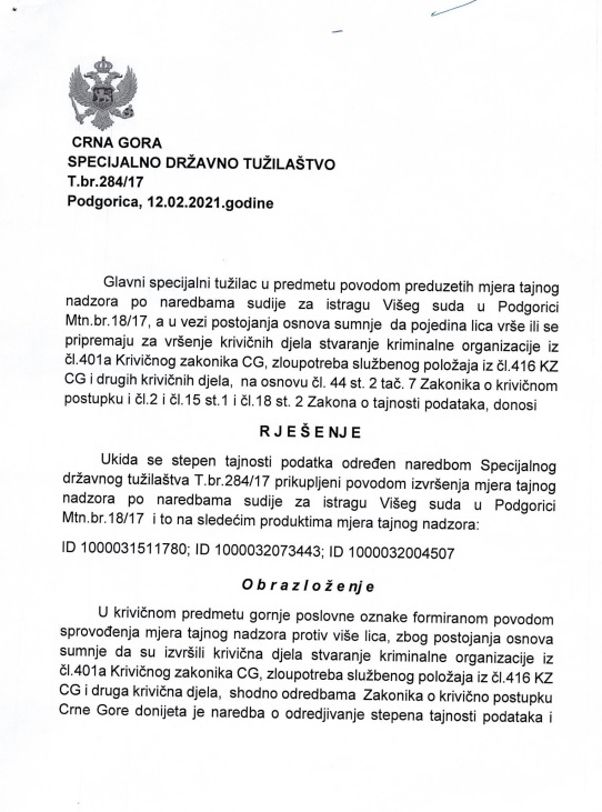 Takođe, želimo da ukažemo i da je taj uticaj jednim dijelom i ostvaren prema pojedincima u Specijalnom državnom tužilaštvu, pa radi razjašnjenja eventualnih nedoumica koje bi javnost mogla da ima, a u vezi javnog obraćanja više lica, uključujući i specijalnog tužioca Ž.S., u vezi postupanja Specijalnog državnog tužilaštva i Specijalnog policijskog odjeljenja, a kako cijenimo da je radi objektivnog informisanja javnosti, jer je prevashodan interes javnosti da ima objektivna saznanja, prezentujemo dio materijala dobijenog po naredbama sudije za istragu Višeg suda u Podgorici MTN.br.18/17 o sprovođenju mjera tajnog nadzora prema više lica zbog postojanja osnova sumnje da su izvršili ili vrše krivična djela stvaranje kriminalne organizacije (čl.401a KZ CG), zloupotreba službenog položaja (čl.416 KZ CG), iznuda (čl.250 KZ CG), nedozvoljeno držanje oružja i eksplozivnih materija (čl.403 KZ CG).