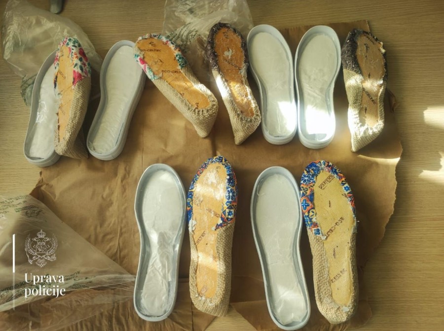 “Prilikom kontrole policijski službenici su kod H.T. pronašli kartonsku kutiju, u kojoj je pregledom pronađena platnena obuća sa vidljivim oštećenjima. Detaljnim pregledom je utvrđeno da je u obući bilo sakriveno šest pvc pakovanja sa praškastom materijom bijele boje, nalik na sintetičku drogu amfetamin – tzv. spid – ukupne mase oko 515 grama”, navodi se u saopštenju. (Foto: Uprava policije )