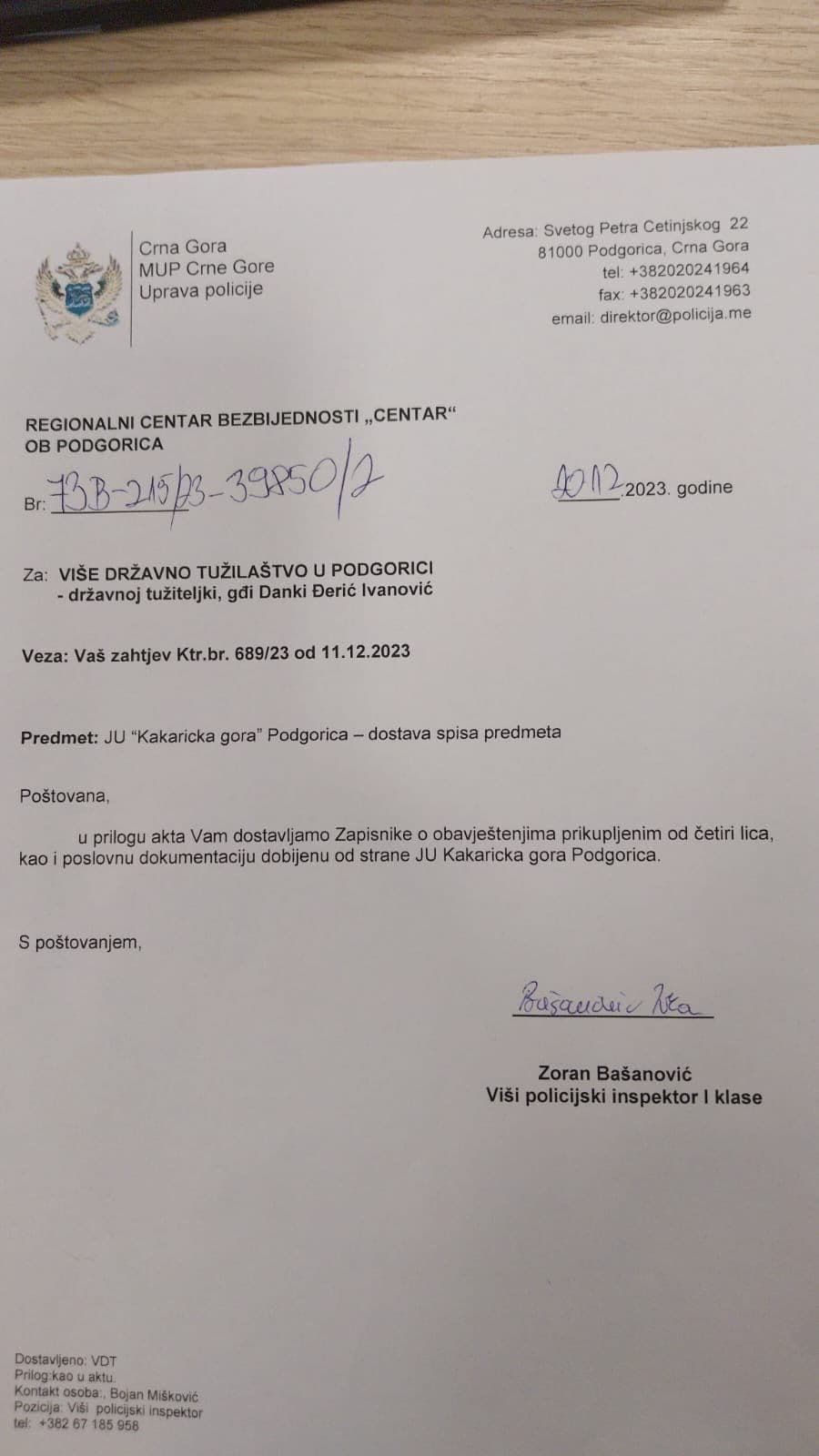 Ranije danas, Pobjedi je iz Višeg državnog tužilaštva saopšteno da policija još nije dostavila traženi materijal, zbog čega će urgirati da postupi po njihovom nalogu.”U odnosu na tvrdnje iznijete u tekstu Pobjede pod naslovom “Šaranović tvrdi da je dokumentacija iz “Kakaricke gore” proslijeđena Tužilaštvu, Medenica kaže da je još nisu dobili”, dostavljamo dokument koji potvrđuje da su zapisnici vezani sa pomenuti slučaj dostavljeni Višem Državnom Tužilaštvu u Podgorici”, naveli su iz MUP-a.