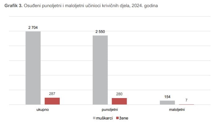 Ukupan broj osuđenih lica u 2024. godini iznosi 2.991. Većinu osuđenih čine muškarci sa 90,4 odsto ili 2 704, dok žene čine 9,6 odsto od ukupnog broja osuđenih lica, odnosno 287.