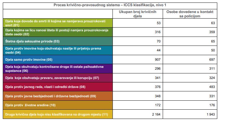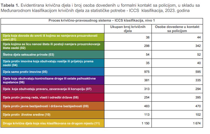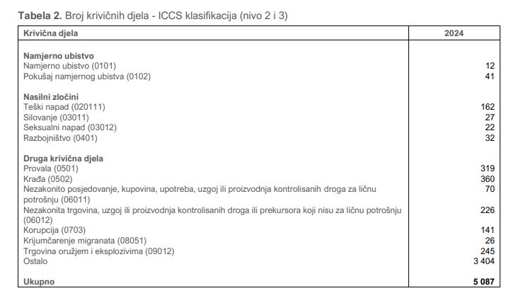 U 2024. godini ukupan broj krivičnih djela prijavljenih policiji iznosio je 5.087, dok je broj osoba dovedenih u formalni kontakt sa policijom bio 4.802.