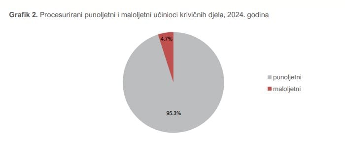 Ukupan broj procesuiranih lica u 2024. godini iznosi 10 650. Od tog broja, punoljetni učinioci čine 95,3 odsto ili 10 152, dok maloljetni učinioci čine 4,7 odsto od ukupnog broja procesuiranih lica, odnosno 498.