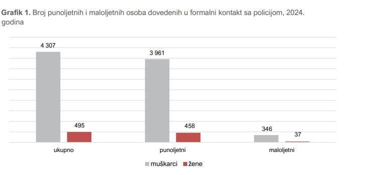 Ukupan broj osoba dovedenih u formalni kontakt sa policijom u 2023. godini iznosi 4.343. Većinu osoba čine muškarci sa 90 odsto ili 3.909, dok žene čine 10 odsto od ukupnog broja osoba dovedenih u formalni kontakt sa policijom, odnosno 434, piše CdM.