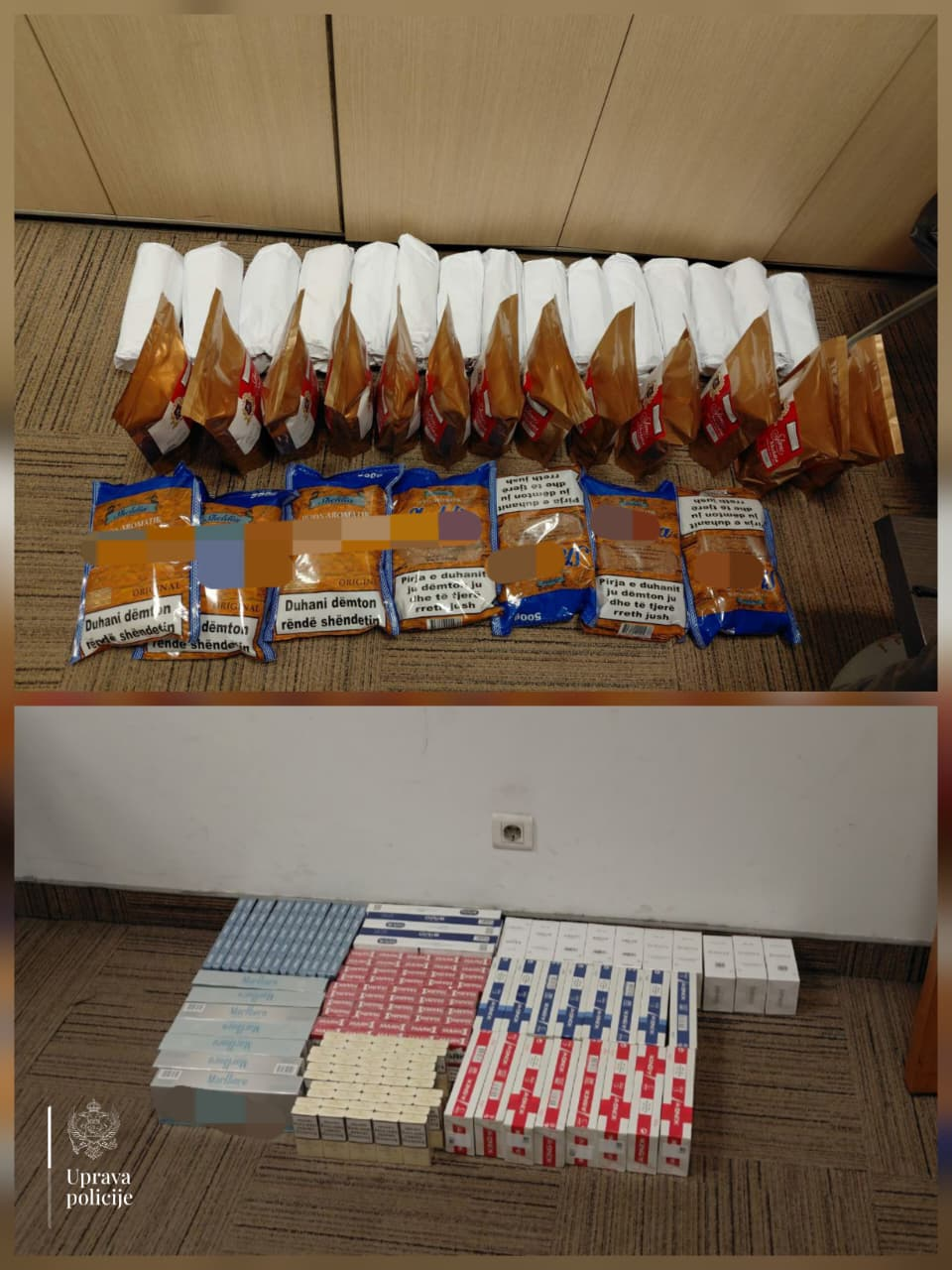 Policija je zaustavila i kontrolisala putničko motorno vozilo marke “Audi“, podgoričkih registarskih oznaka i tom prilikom u prtljažniku pronašla kese sa cigaretama različitih marki i pakovanja rezanog duvana, i to: 550 paklica cigareta bez akciznih markica i 35 pakovanja rezanog duvana od po pola kilograma, odnosno ukupno 17,5 kilograma duvana.