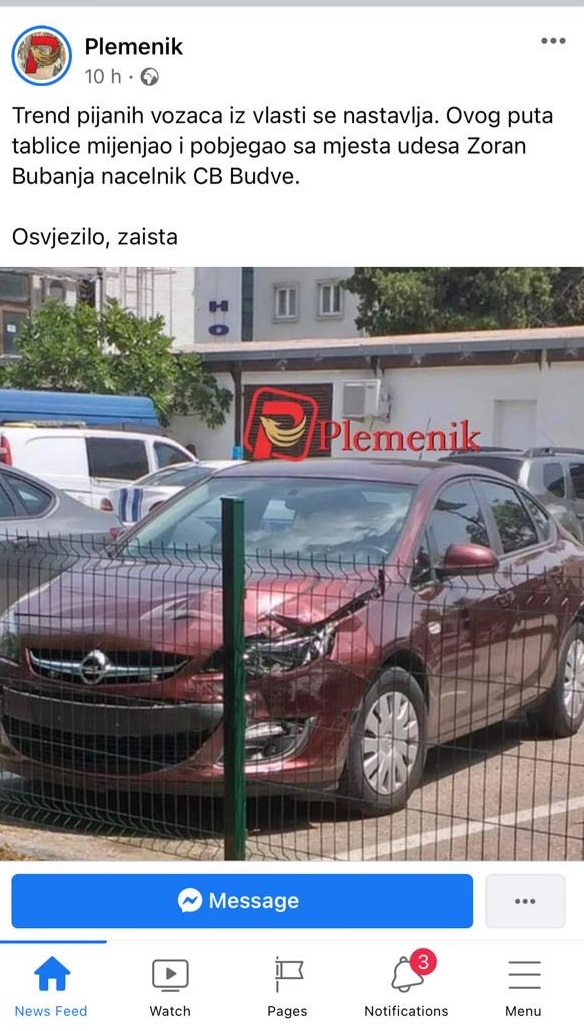 Na društvenoj mreži Fejsbuk pojavila se fotografija udarenog vozila marke Opel, gdje se navodi da je udes ovim automobilom napravio novi načelnik CB Budva Zoran Bubanja. Takođe, piše da je pobjegao sa mjesta udesa i mijenjao tablice na vozilu.