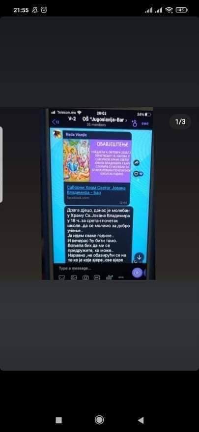 Takođe, Osnovno državno tužilaštvo u Baru formiralo je predmet protiv učiteljice Rade Višnjić, koja je đake odjeljenja V-2 OŠ “Jugoslavija” preko vajber-grupe pozvala da joj se pridruže molitvi u Sabornom hramu Svetog Jovana Vladimira.