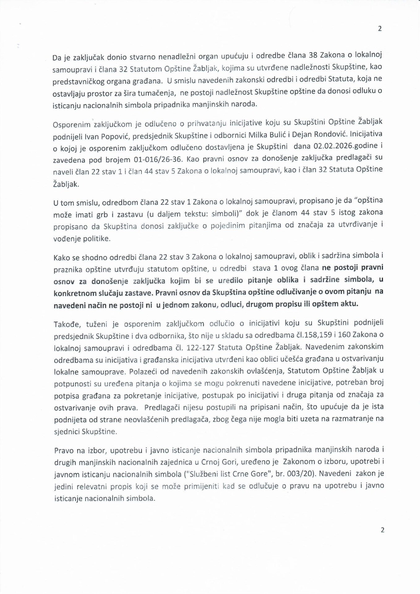 “Tužbu smo podnijeli zbog povrede pravila postupka i pogrešne primjene materijalnog prava, jer su u postupku donošenja osporenog Zaključka o isticanju trobojke učinjene brojne povrede pravila postupka propisane Zakonom o lokalnoj samoupravi i Statutom Opštine Žabljak”, kazao je Božović.
