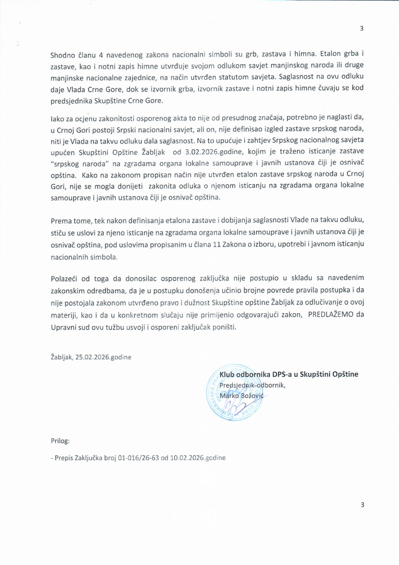 Iz Kluba odbornika DPS Žabljak predlažu da Upravni sud usvoji ovu tužbu i osporeni zaključak SO Žabljak na osnovu kojeg je protivzakonito istaknuta trobojka poništi.
