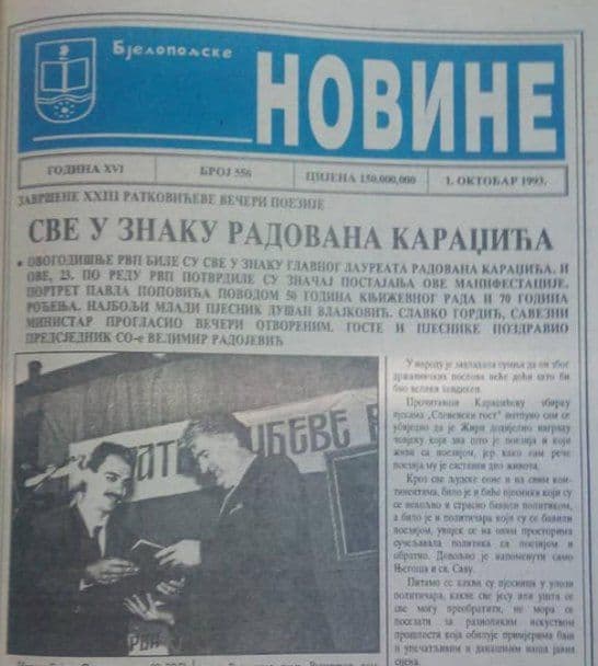 Karadžić je nagradu „Risto Ratković“ dobio 1993. godine za knjigu poezije „Slovenski gost“. Samo nekoliko mjeseci nakon što se dogodio stravični ratni zločin u Štrpcima, kada je iz voza Beograd – Bar odvedeno i ubijeno 20 ljudi, Crna Gora je Karadžiću uručila značajno pjesničko priznanje. U tom vozu su, ako je to Crnoj Gori bilo važno, bili i njeni državljani, koji nijesu bili srpske nacionalnosti. Najstarija žrtva imala je 59, a najmlađa 16 godina. Većina ubijenih bili su iz Prijepolja, Bijelog Polja, Beograda i Podgorice. Ubili su ih pripadnici Vojske Republike Srpske i paravojne jedinice „Osvetnici“, predvođeni Milanom Lukićem i Nebojšom Ranisavljevićem. Godinu ranije, iz Herceg Novog su Karadžiću i Mladiću isporučene u smrt izbjeglice koje su spas od rata potražile u Crnoj Gori.
