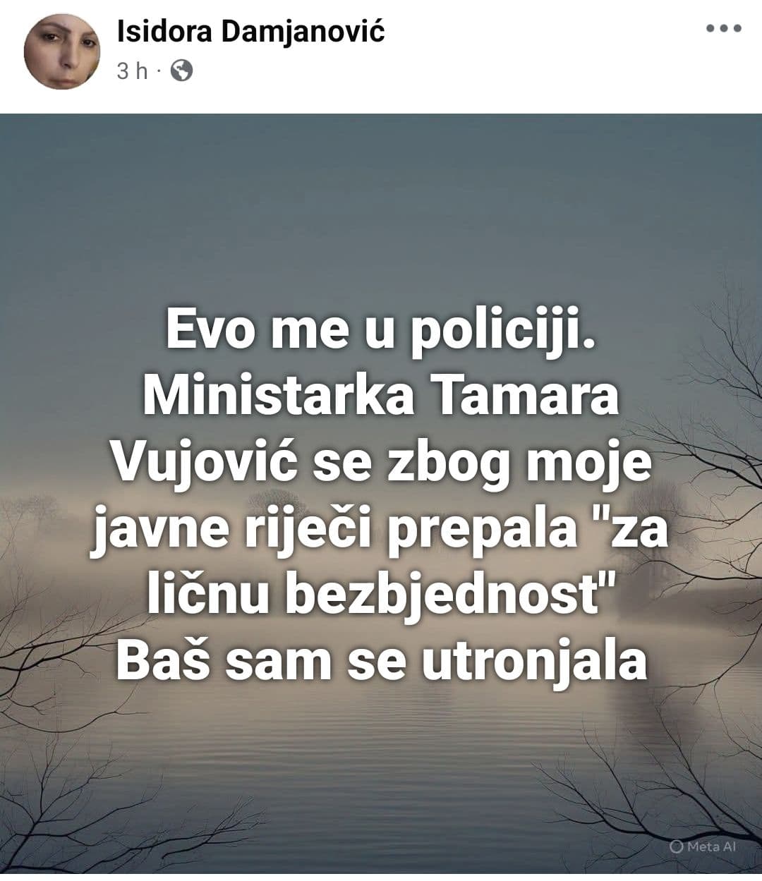 – Evo me u policiji. Ministarka Tamara Vujović se zbog moje javne riječi prepala „za ličnu bezbjednost“. Baš sam se utronjala – napisala je Damjanović na svom Fesjbuk profilu.