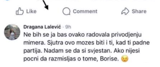 ,,Ne bih se ja baš ovako radovala privođenju mimera. Sjutra ovo možeš biti i ti, kad ti padne partija. Nadam se da si svjestan. Ako nijesi, počni da razmišljaš o tome, Borise”, komentarisala je Lalević na Fejbuku.