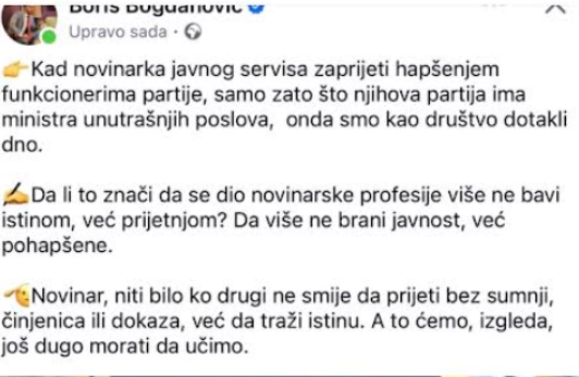 ,,Kad novinarke Javnog servisa zaprijeti hapšenjem funkcionera partije, samo zato što njihova stranka ima ministara unutrašnjih poslova, onda smo kao društvo dotakli dno.