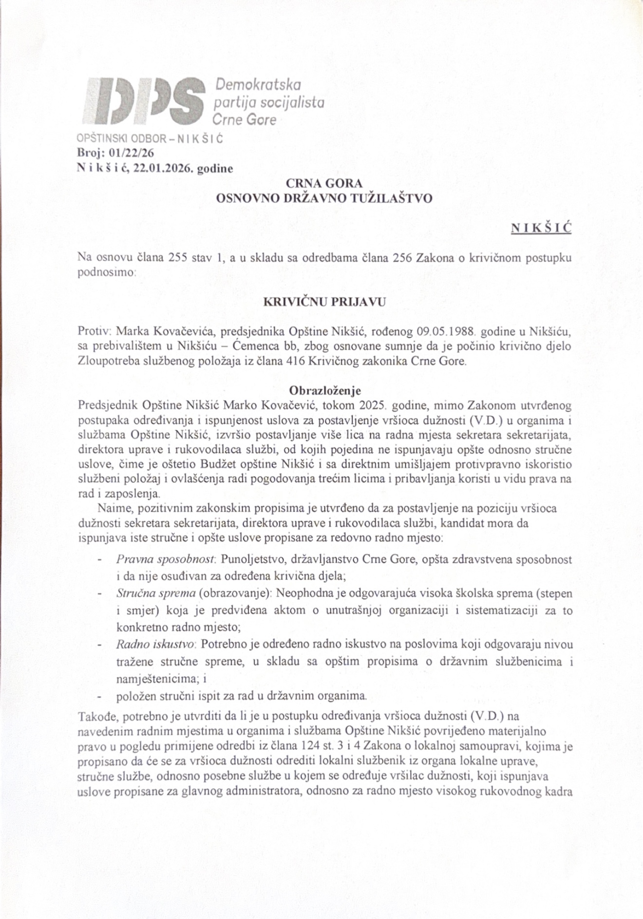 dužnosti u organima i službama Opštine Nikšić, izvršio postavljenje više lica na radna mjesta sekretara sekretarijata, direktora uprave i rukovodilaca službi, od kojih pojedina ne ispunjavaju opšte odnosno stručne uslove.