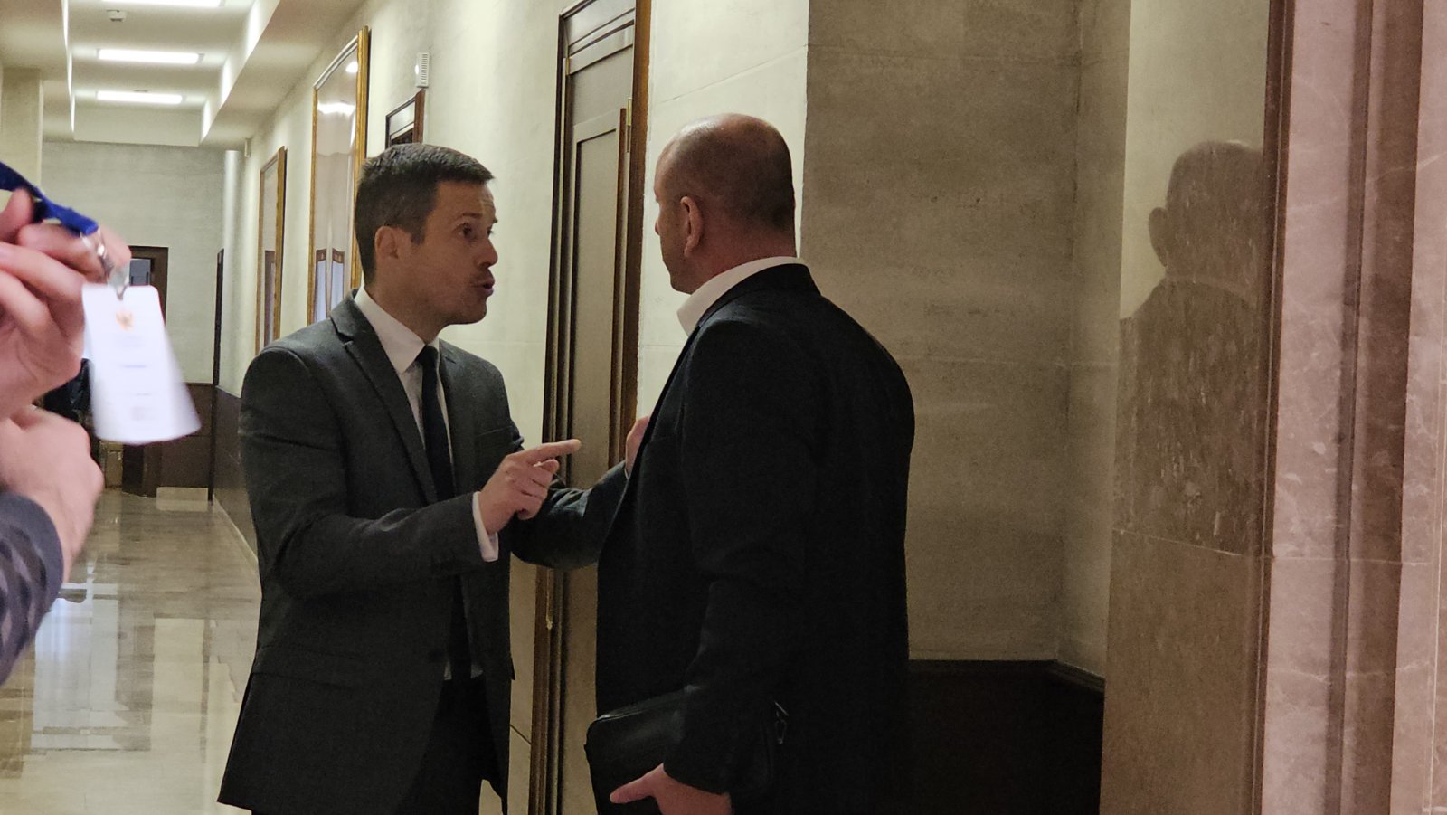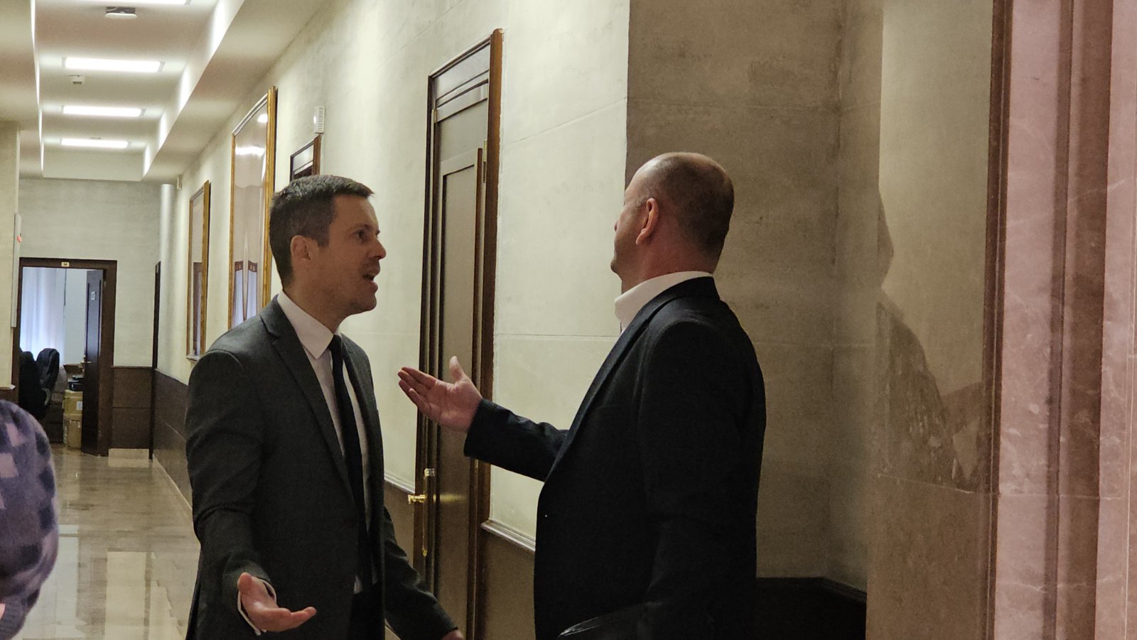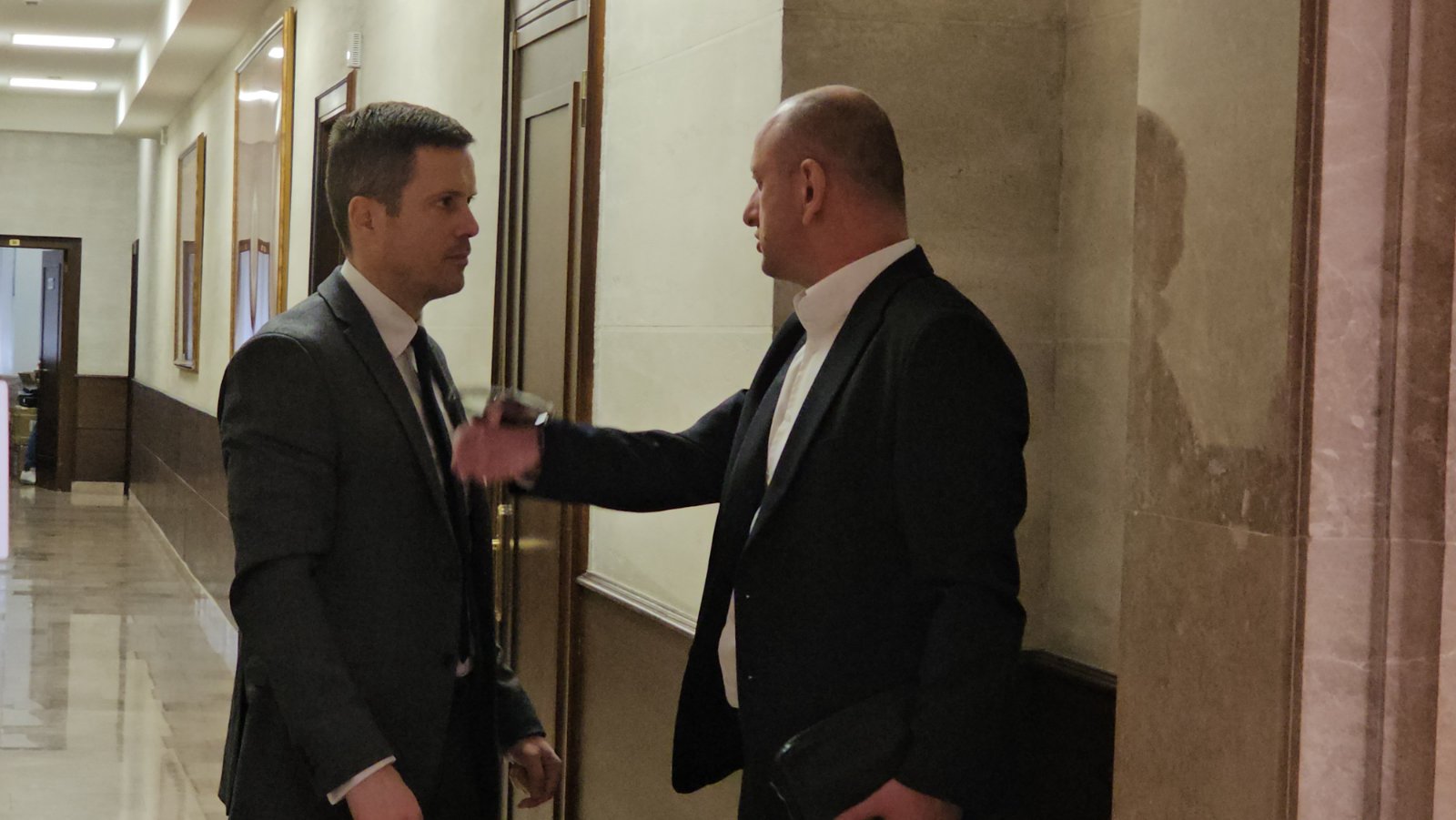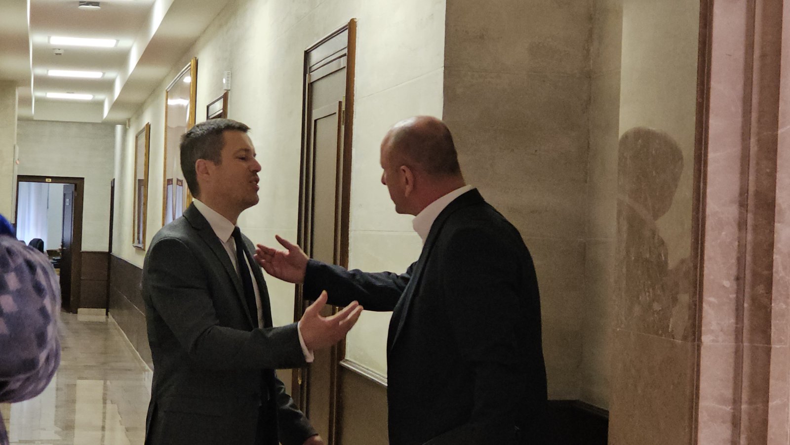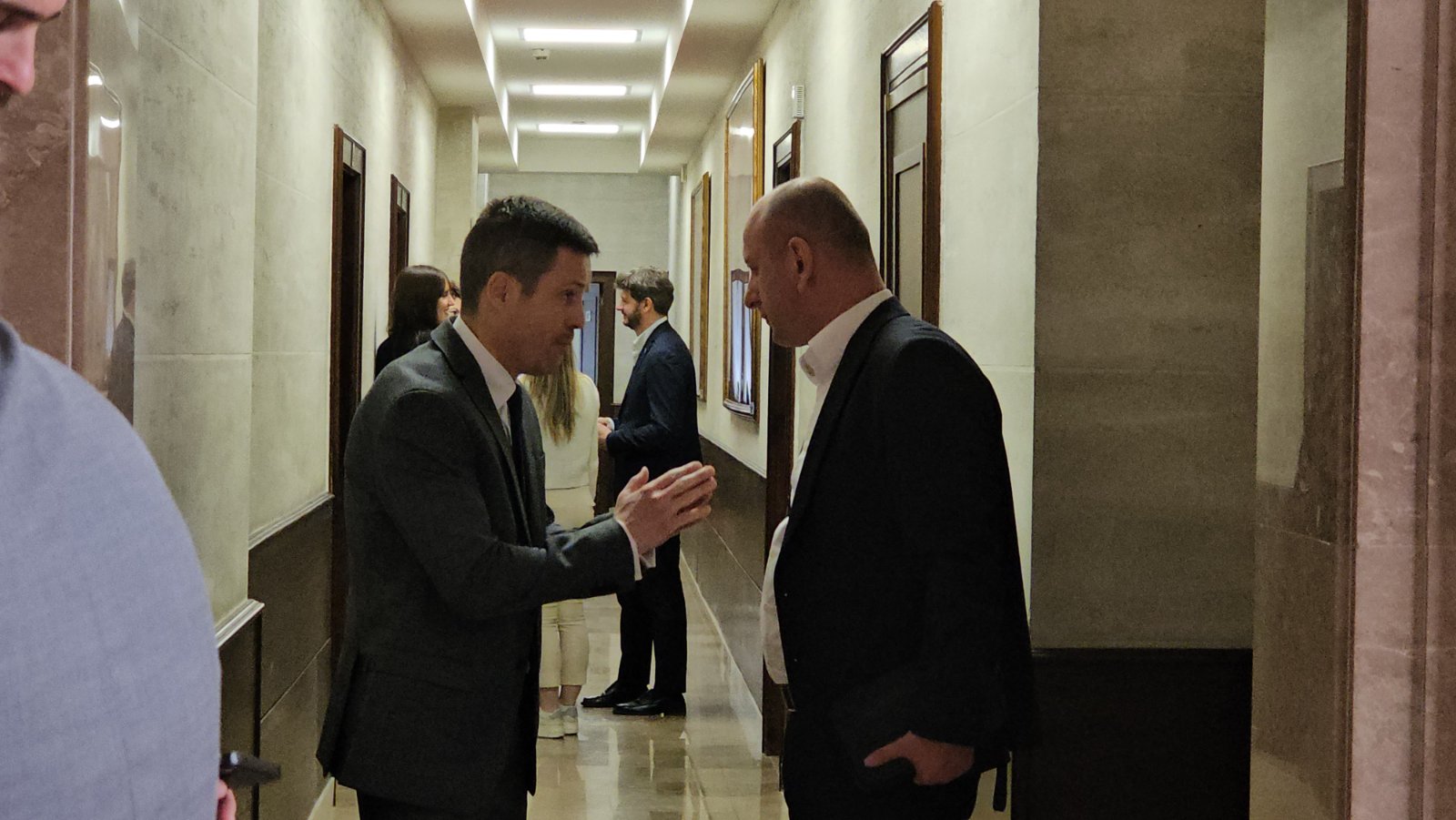Nakon završetka Omladinskog parlamenta u Skupštini Crne Gore, gradonačelnik Podgorice Šaša Mujović i poslanik Demokratske narodne partije Milan Knežević susreli su se u holu parlamenta.