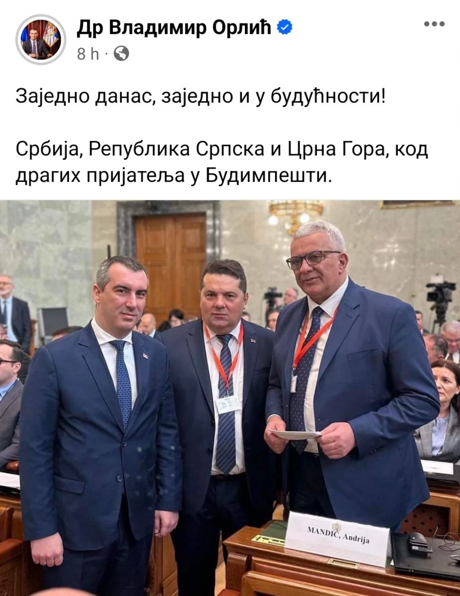 Orlić je imao i zadovoljstvo da ispod fotografije tri predsjednika Skupštine, dvije države i srpskog entiteta u BiH, napiše i riječi: Srbija, Republika Srpska i Crna Gora kod dragih prijatelja u Budimpešti. On poručuje Zajedno danas, zajedno i u budućnosti.