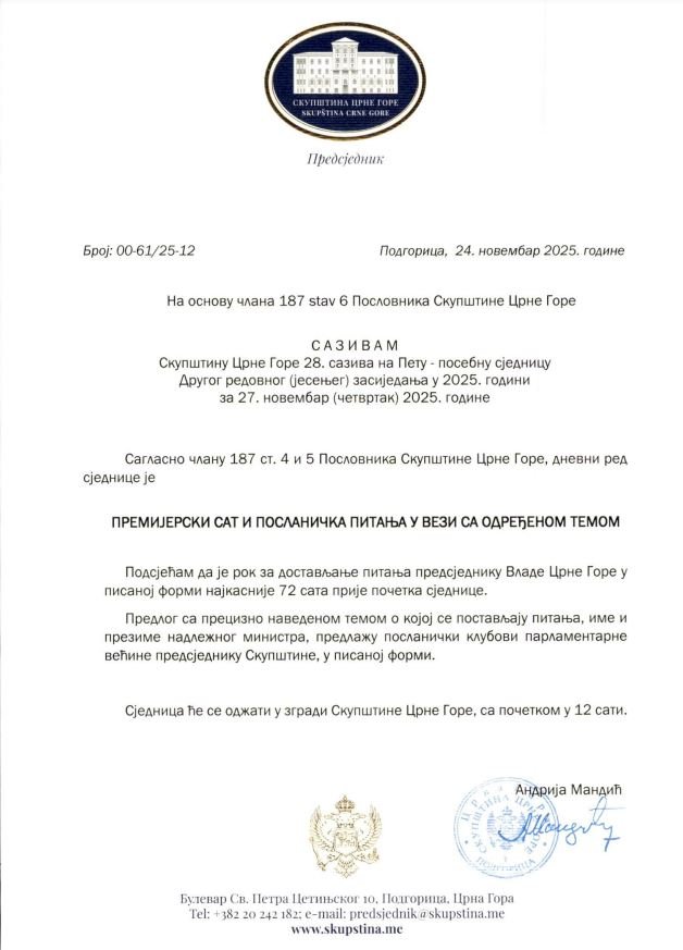 Poslanicima je poručeno da rok za dostavljanje pitanja predsjedniku Vlade Crne Gore u pisanoj formi ističe 72 sata prije početka sjednice.