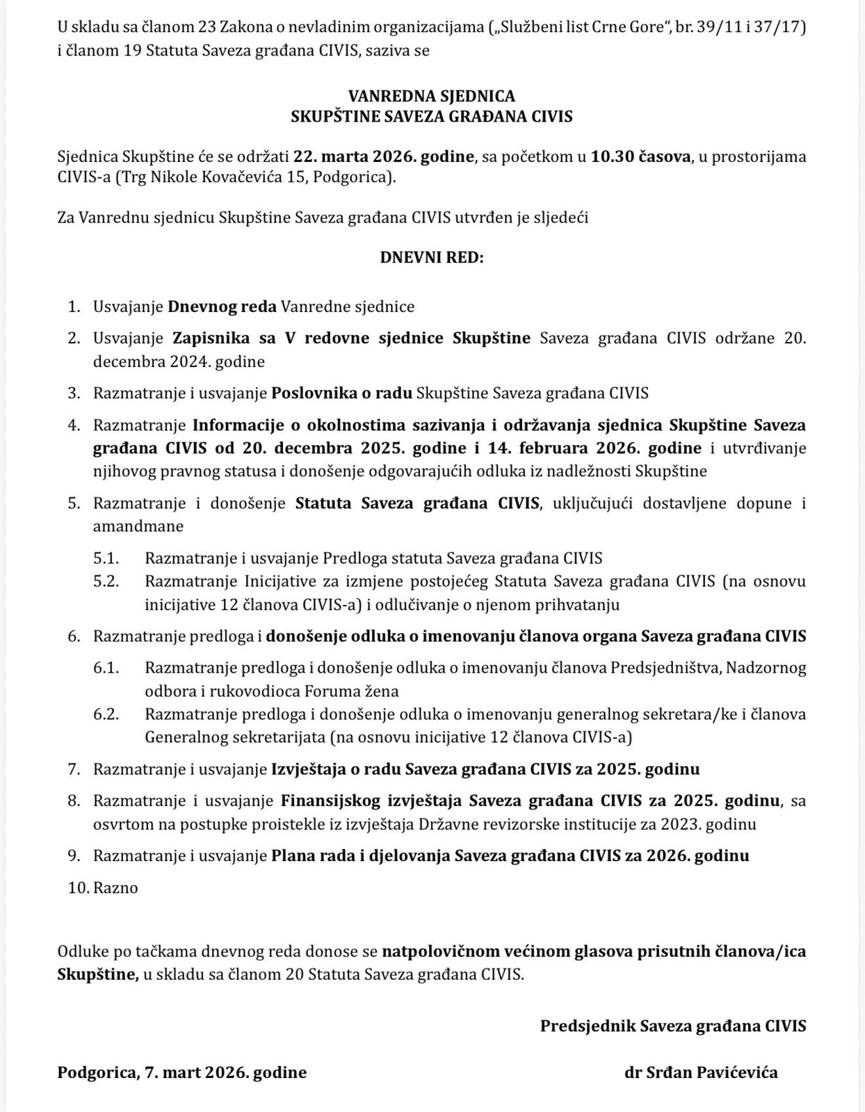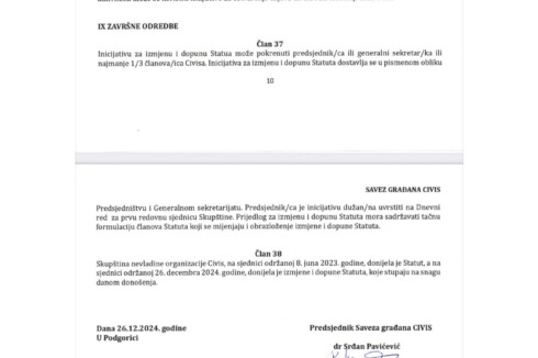 Delegati navode da sjednica nije sazvana u skladu sa Statutom, jer se raspravljalo o izmjenama i dopunama koji nisu bili predviđeni članom 37. Statuta. Prethodna sjednica održana 14. februara, na kojoj je predložena izmjena Statuta, nije prihvaćena od strane većine, a izvještaj o radu za 2025. godinu nije usvojen.„Nakon toga, sjednica je prekinuta, a potom i poništena od strane predsjednika Srđana Pavićevića, uz obrazloženje da nije bila sazvana u skladu sa statutarnim rokovima. Nova sjednica zakazana je za 22. mart 2026. godine“, ističu potpisnici.