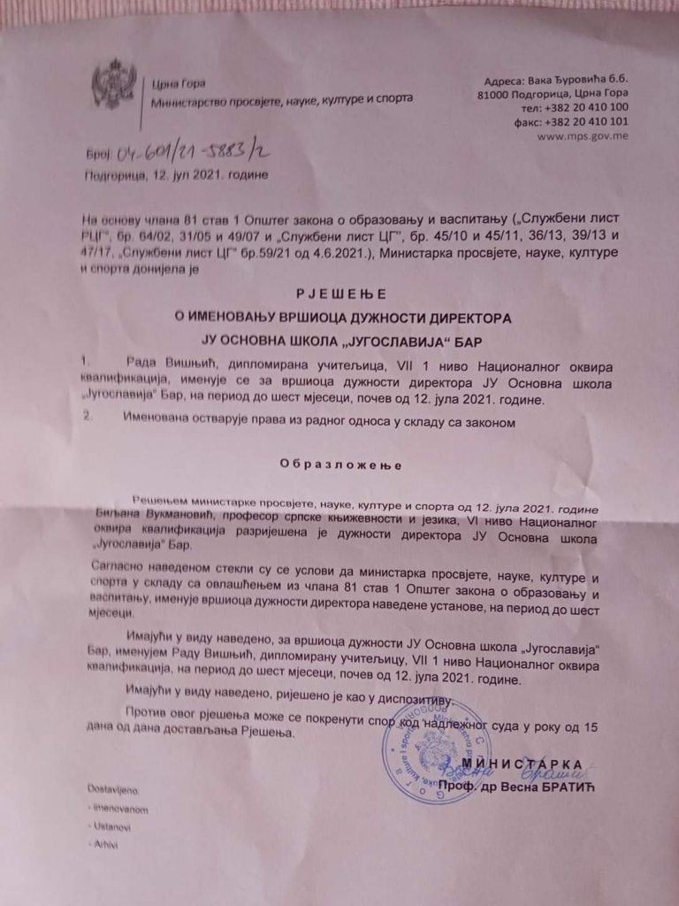 „Saglasno navedenom stekli su se uslovi da ministarka prosvjete, nauke, kulture i sporta, u skladu sa ovlašćenjem iz člana 81,stav 1, Opšteg zakona o obrazovanju i vaspitanju, imenuje vršioca dužnosti direktora avedene ustanove, na period od šest mjeseci. Imajući u vidu navedeno, za vršioca dužnosti JU OŠ „Jugoslavija“ Bar imenujem Radu Višnjić, diplomiranu učiteljicu, VII 1 nivo Nacionalnog okvira kvalifikacije, na period od šest mjeseci. Imajuči u vidu navedeno, za riješeno je kao u dispozitivu“, stoji u rješenju, koje potpisuje ministarka Bratić, uz napomenu da se protiv ovog rješenja može pokrenuti spor kod nadležnog suda u roku od 15 dana od dana dostavljanja rješenja.