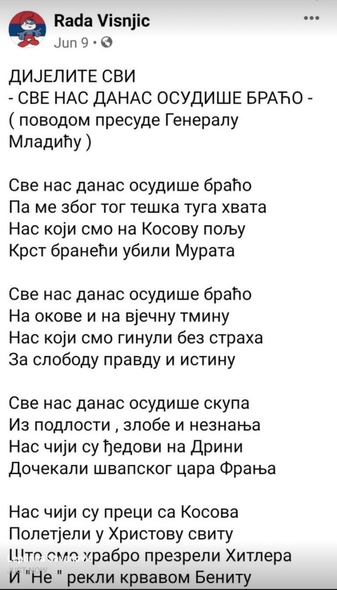 ”Prosvjetna radnica” Rada Višnjić nedavno je objavila pjesmu na svom Fejsbuk profilu povodom presude ratnom zločincu Ratku Mladiću.