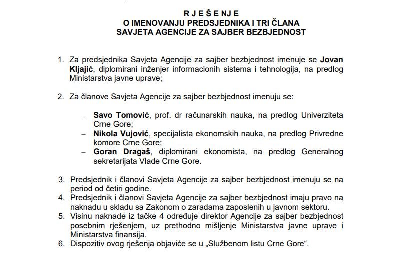 7.1. Predlogu za imenovanje predsjednika i tri člana Savjeta Agencije za sajber bezbjednost.