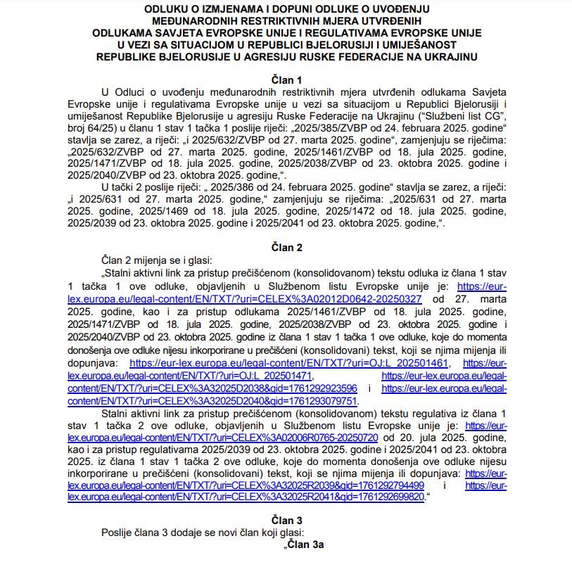 1. Predlogu odluke o izmjenama i dopuni Odluke o uvođenju međunarodnih restriktivnih mjera utvrđenih odlukama Savjeta Evropske unije i regulativama Evropske unije u vezi sa situacijom u Republici Bjelorusiji i umiješanost Republike Bjelorusije u agresiju Ruske Federacije na Ukrajinu;