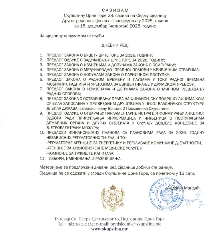 Predsjednik Skupštine Andrija Mandić zakazao je sjednicu za 18. decembar na kojoj je prva tačka dnevnog reda Predlog zakona o budžetu za 2026.