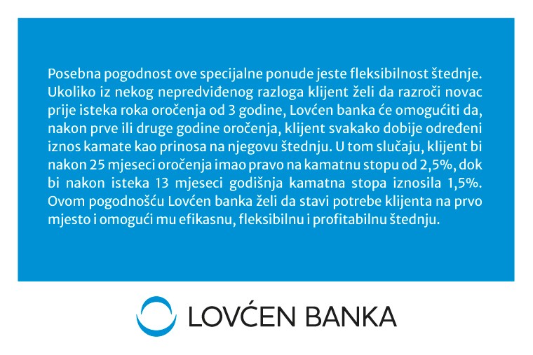 Ovom pogodnošću Lovćen banka želi da stavi potrebe klijenta na prvo mjesto i omogući mu efikasnu, fleksibilnu i profitabilnu štednju.