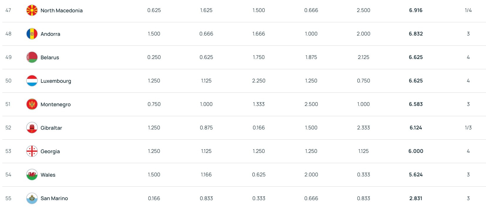 Ispod Crne Gore ostale su samo četiri zemlje, Gibraltar, Gruzija, Vels i San Marino, što pokazuje koliko smo daleko od ozbiljnijeg evropskog niova.Preporučeno