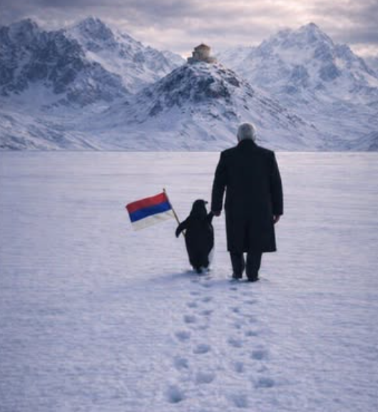 Na fotografiji generisanoj vještačkom inteligencijom Tramp vodi pingvina koji nosi američku zastavu po terenu koji bi trebalo da predstavlja Grenland, uz opis „Prigrli pingvina“.