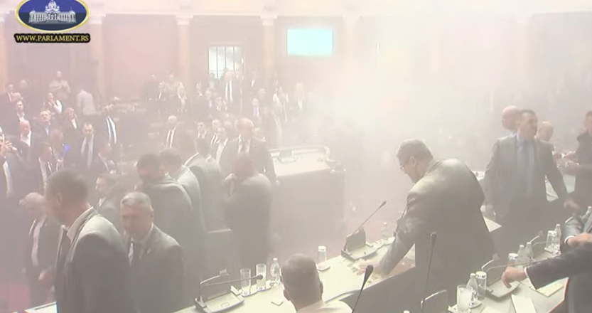 Poslanici opozicije stoje u centralnom dijelu sale i prave buku. Bačene su ponovom dimne bombe, lete i flaše.