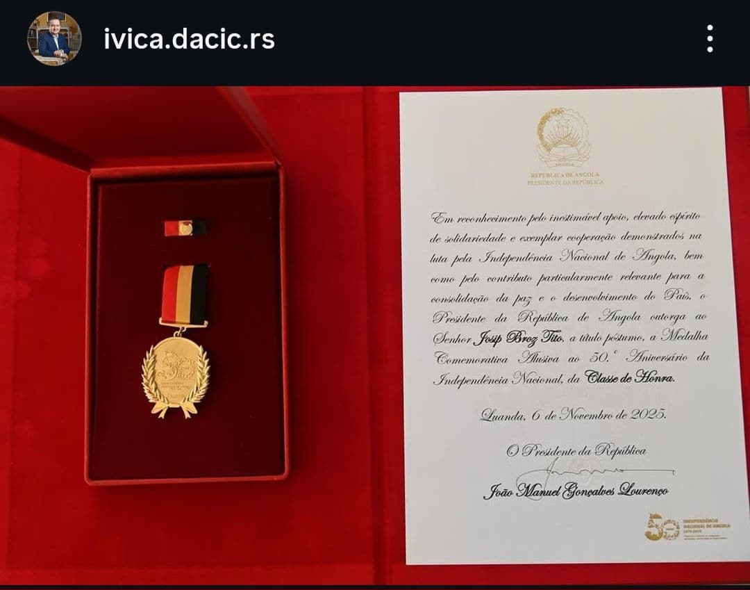 Uz objavu, Dačić je podijelio i fotografiju ordena i pratećeg pisma predsjednika Angole.