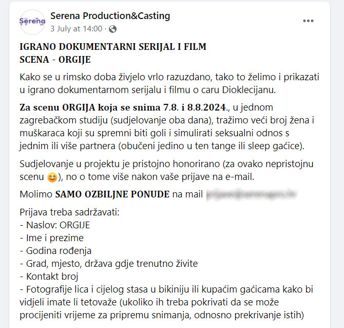 „Kako se u rimsko doba živjelo vrlo razuzdano, tako to želimo i prikazati u igrano dokumentarnom serijalu i filmu o caru Dioklecijanu. Za scenu orgija koja se snima 7. i 8. avgusta2024. u jednom zagrebačkom studiju (sudjelovanje oba dana), tražimo veći broj žena i muškaraca koji su spremni biti goli i simulirati seksualni odnos s jednim ili više partnera (obučeni jedino u ten tange ili sleep gaćice)“, navodi se u oglasu objavljenom na Facebook stranici Agencije.
