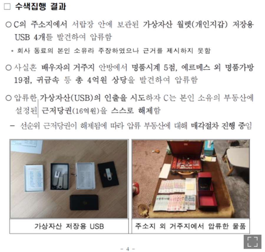 Prema navodima blokčejn istraživačkog centra Univerziteta Hansung (direktor Džo Džeu), Poreska uprava je nedavno objavila saopštenje o rezultatima terenskih pretresa 124 poreska dužnika, piše B92.Problematičan je bio ,,slučaj 3“, koji se odnosio na prinudnu naplatu od dužnika označenog kao C. Poreska uprava je saopštila da su u fioci na adresi prebivališta pronađena i zapljenjena četiri USB uređaja za čuvanje kripto-novčanika. Sporna je fotografija objavljena uz saopštenje, kojom je uprava željela da prikaže uspjeh akcije.