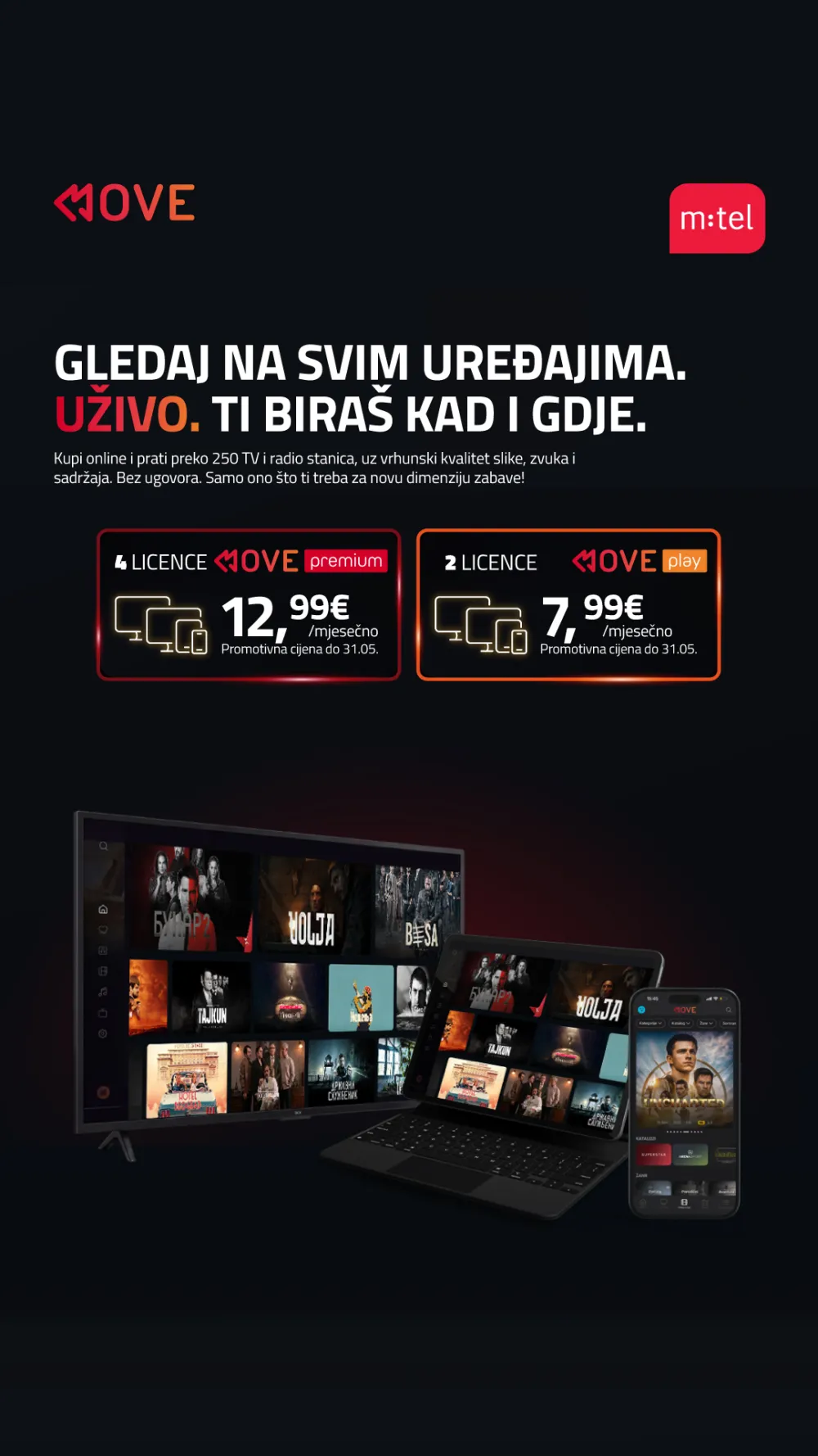 Podsjećamo da je Move TV – najmodernija OTT platforma u rangu sa vodećim svjetskim striming platformama sa preko 250 kanala, premotavanjem do sedam dana unazad, vrhunskim kvalitetom slike, personalizovanim sadržajem. MOVE donosi niz funkcionalnosti koje mijenjaju klasično TV iskustvo. Pored vraćanja unazad, gledaoci mogu pauzirati sadržaj uživo ili nastaviti gledanje na različitim uređajima — bilo da su kod kuće ili u pokretu.