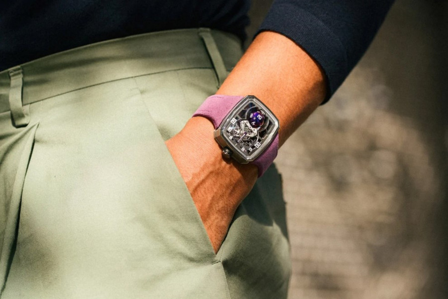 Dizajn kućišta je pametno osmišljen, veći dio zapremine je raspoređen horizontalno, što ga čini udobnim za nošenje, piše portal A Blog To Watch. Pošto nema tradicionalnu ušicu, ljubičasti kaiš od brušene kože je direktno povezan sa kućištem. Odsjaj je minimiziran zahvaljujući visokokvalitetnom antirefleksnom premazu.