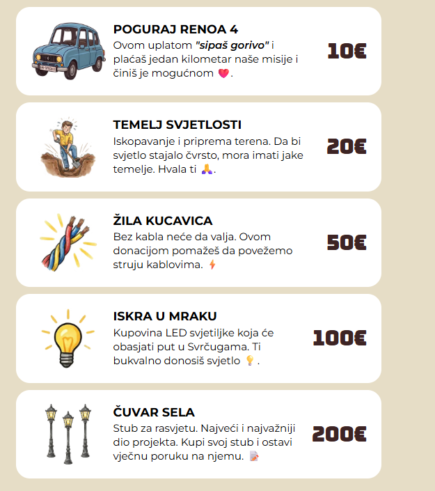 Ova akcija ima jasan i transparentan model: svaka donacija ima svoju svrhu – kilometar puta, temelj rasvjete, LED lampu, stub ili kabl.