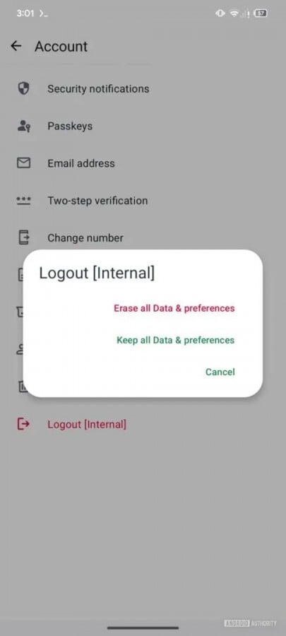 Logout opcija će nuditi dva izbora, jedna će obavljati odjavu uz brisanje svih podataka i postavki, dok će druga zadržavati podatke i postavke. Prva opcija je isto što i deinstalacija WhatsApp-a, odjaviće korisnika i izbrisati sve podatke i postavke aplikacije, no korisnik neće biti uklonjen iz grupa.