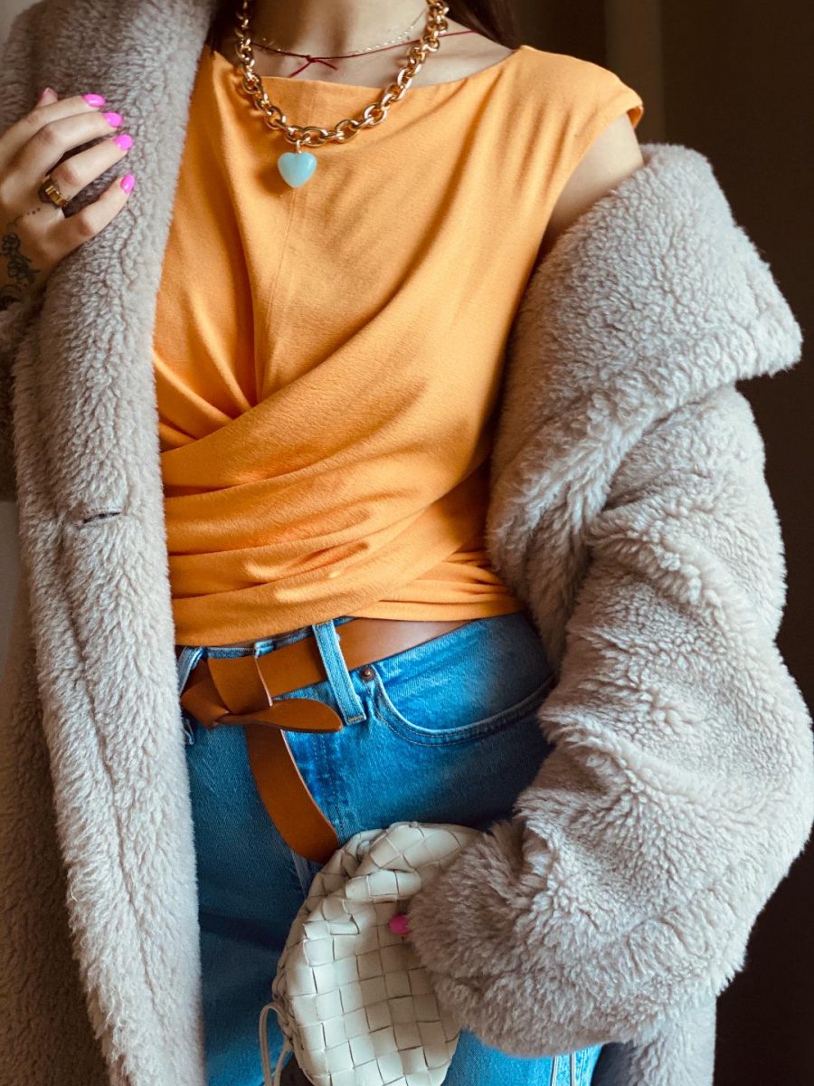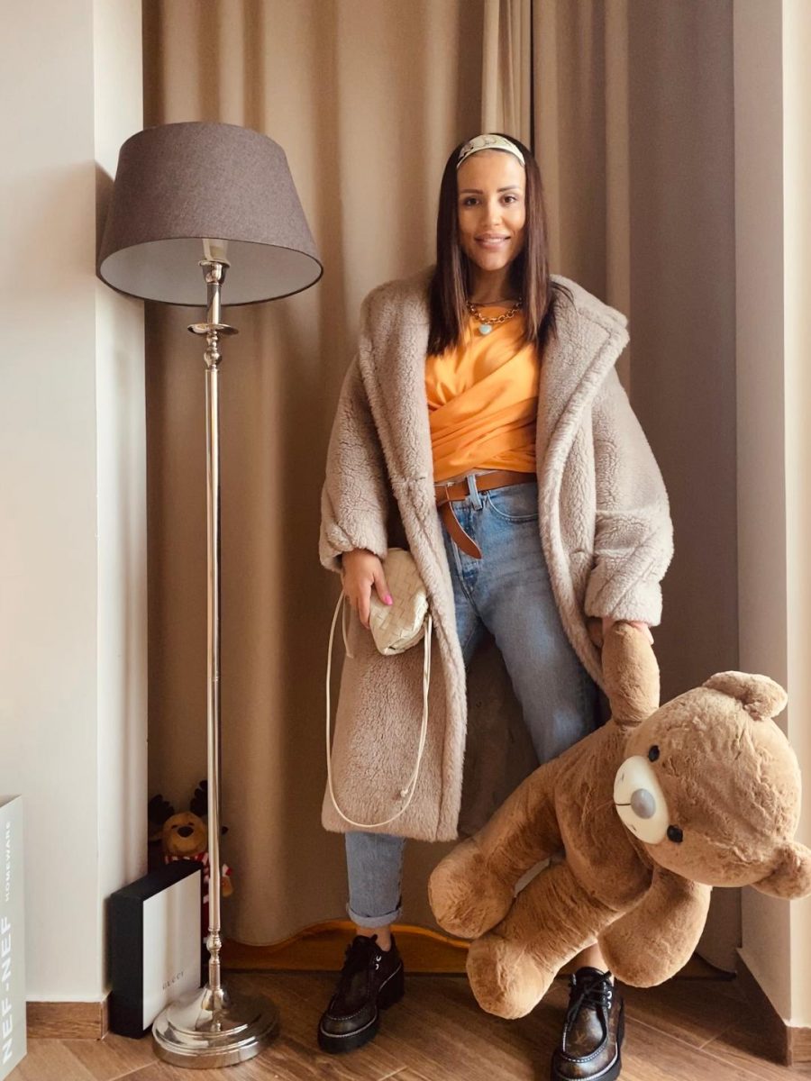 Predlog broj dva je popularan teddy kaput, koji je hit kako prethodne tako i ove sezone i može se nositi u svim prilikama. Ukoliko praznike budete provodili u opuštenom društvu u nekom kafiću ili na sjeveru naše zemlje, ova kombinacija je idealna. Modno i kolorički je usklađena, a topao kaput i udobne cipele zaštitiće vas od vremenskih (ne) prilika. Detalji poput jednostavnog kaiša i Bottega tašne zaokružuju ovu modnu priču.
