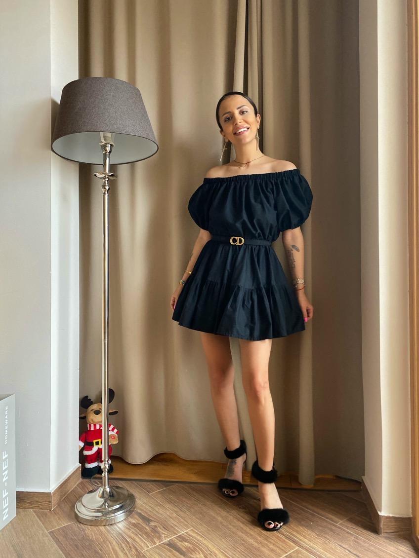 Prvi stajling koji nam je predstavila jeste mala crna haljina, boja koja je uvijek aktuelna. Model sa puf rukavima, idealan je za kućnu varijantu, ukoliko dočekujete goste i želite da ostavite utisak. Jelena je izabrala fenomenalne sandale sa krznom, diskretan nakit i upečatljiv kaiš. Classy zar ne?