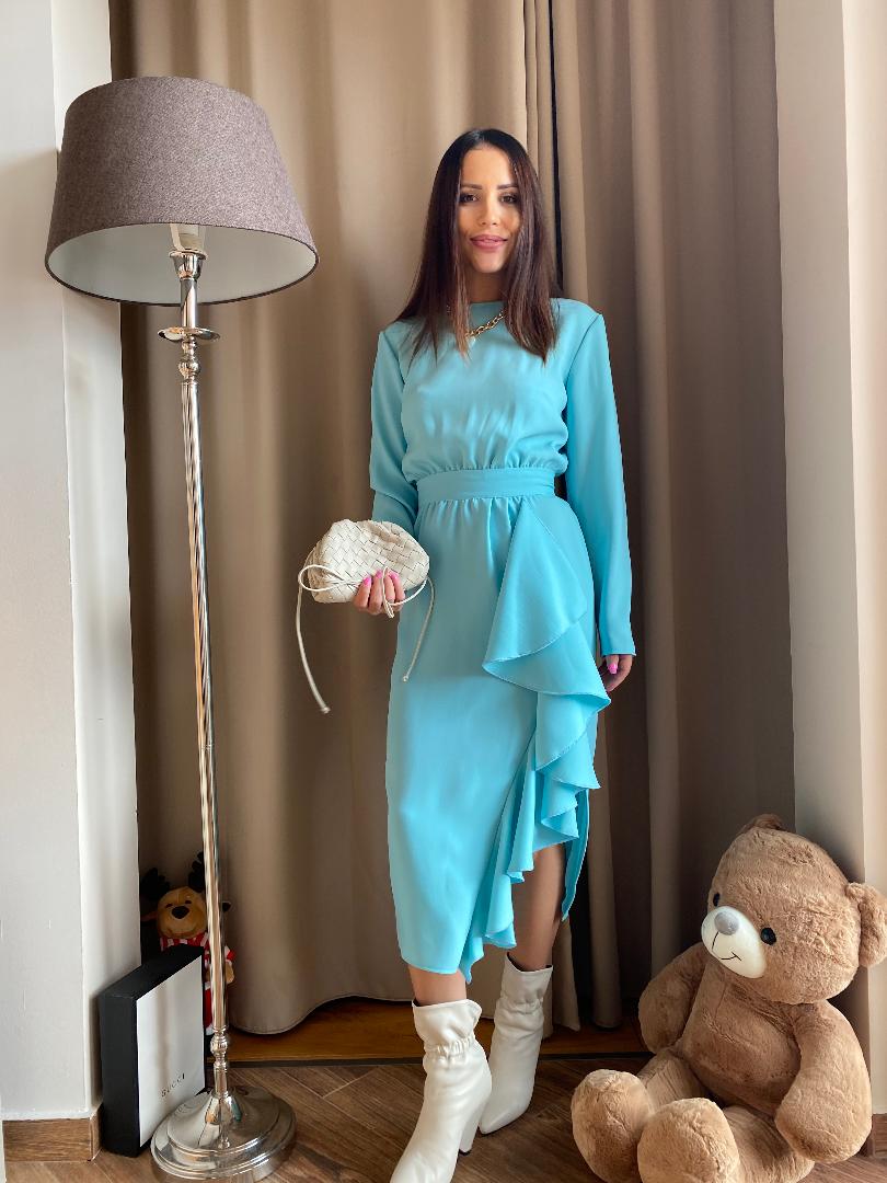 Svi volimo haljine, a model koji vidimo na Jeleni svakako je ultra popularan trenutno. Kroj iz sedamdesetih sa karnerom, koji ističe struk idealan je za svaku fizionomiju. Boja je uklopljiva nezavisno od toga da li ste brineta, plavuša, crvenokosa, jer plava je rijetka boja koja svima stoji.