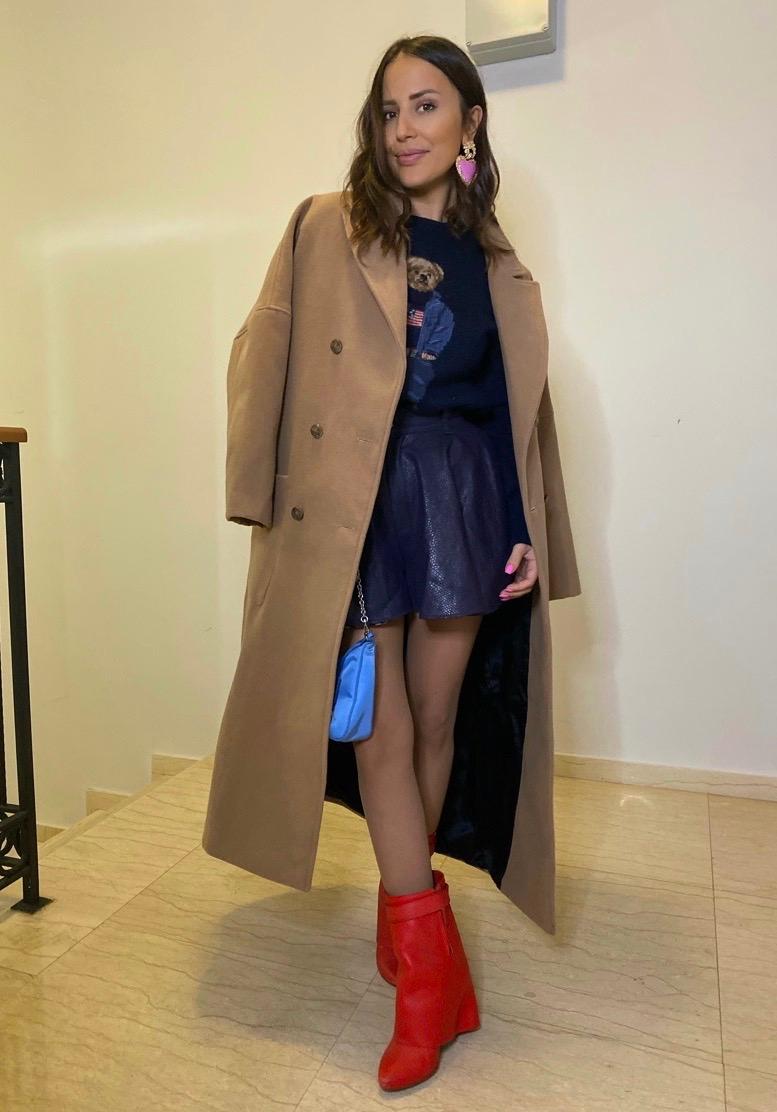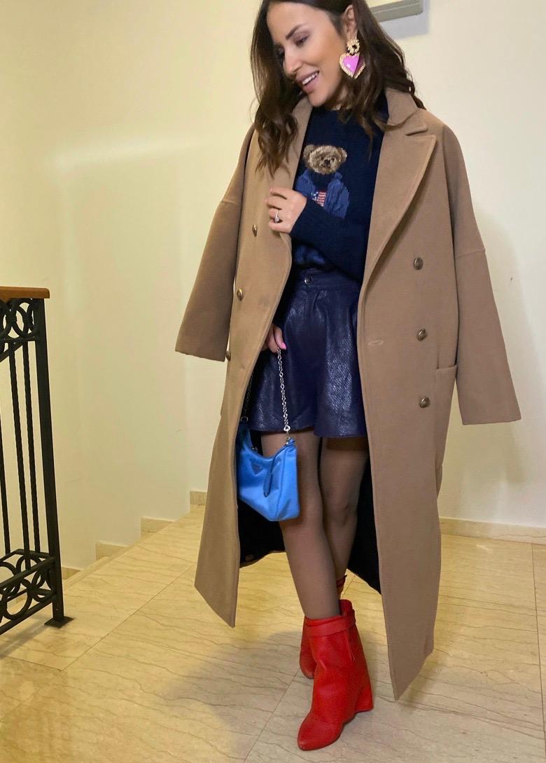 Kratke čizmice Givenchy sa sakrivenom petom i kratak šorts u kombinaciji sa kaputom, idealne su za sate koje ćete provesti u kafiću. Ovaj stajling takođe se može preseliti i nakon ispijanja praznične kafe, u restoran, klub, ili kućnu posjetu. Jelena je pokazala kako džemper može biti dobar u kombinaciji sa vječnim komadom kamel kaputom i interesantnim detaljima.