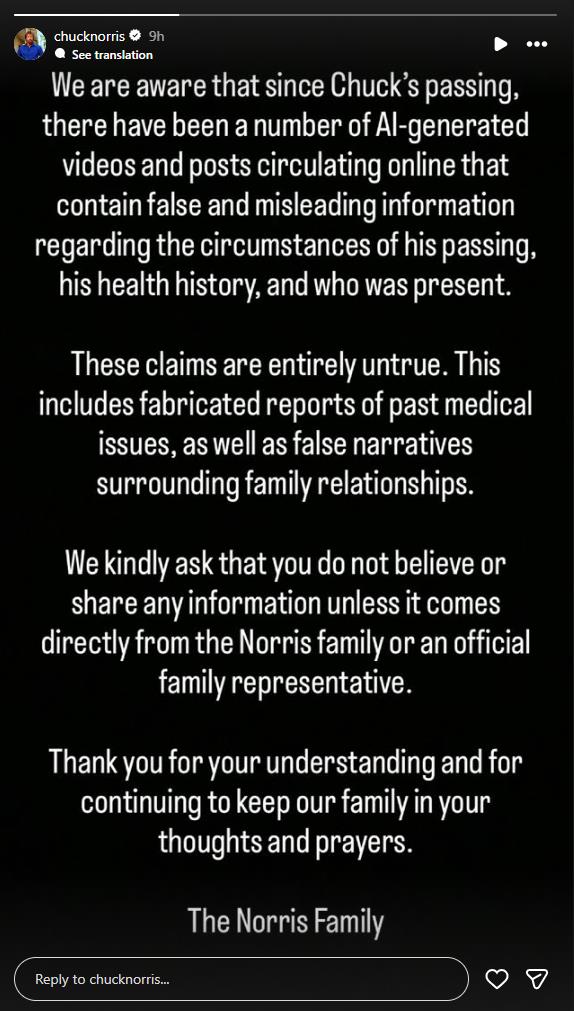 “Svjesni smo da je od Čakove smrti na internetu kružio niz vještački generisanih video snimaka i objava koje sadrže lažne i obmanjujuće informacije o okolnostima njegove smrti, njegovoj zdravstvenoj istoriji i ko je bio prisutan”, navodi se u saopštenju.