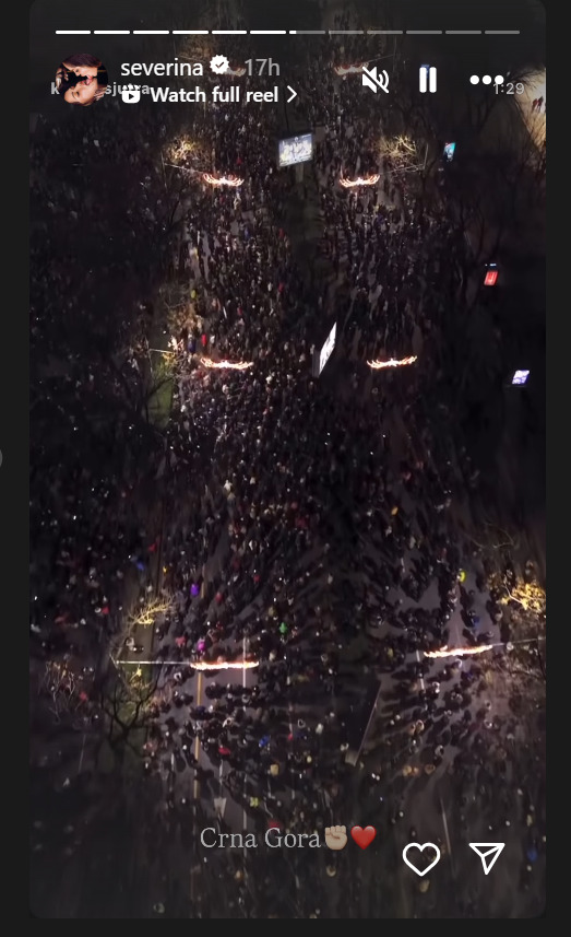 Severina je na svom Instagram profilu podijelila video sa protesta, a uz video je dodala natpis ,,Crna Gora”, uz animaciju stisnute pesnice i srca.
