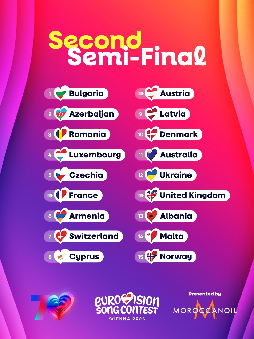 Drugo polufinale, 14. maja, otvara Bugarska, a zatvara Norveška.